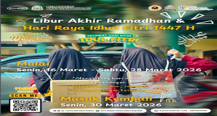 Nomor: 035/MTs.11.09/PP.00.5/III/2026 tentang Pemberitahuan Libur Akhir Ramadhan Tahun 2026 dan Hari Raya Idhul Fitri 1447 H, bersama ini kami sampaikan Jadwal sebagai berikut