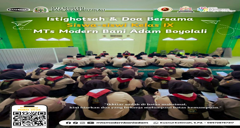 Suasana haru dan khusyuk menyelimuti kegiatan Istighotsah kelas 9 MTs Modern Bani Adam hari ini. Sebelum berhadapan dengan soal-soal TKA, kita bersimpuh memohon ridho-Nya agar setiap jawaban yang dituliskan menjadi jalan kesuksesan.
